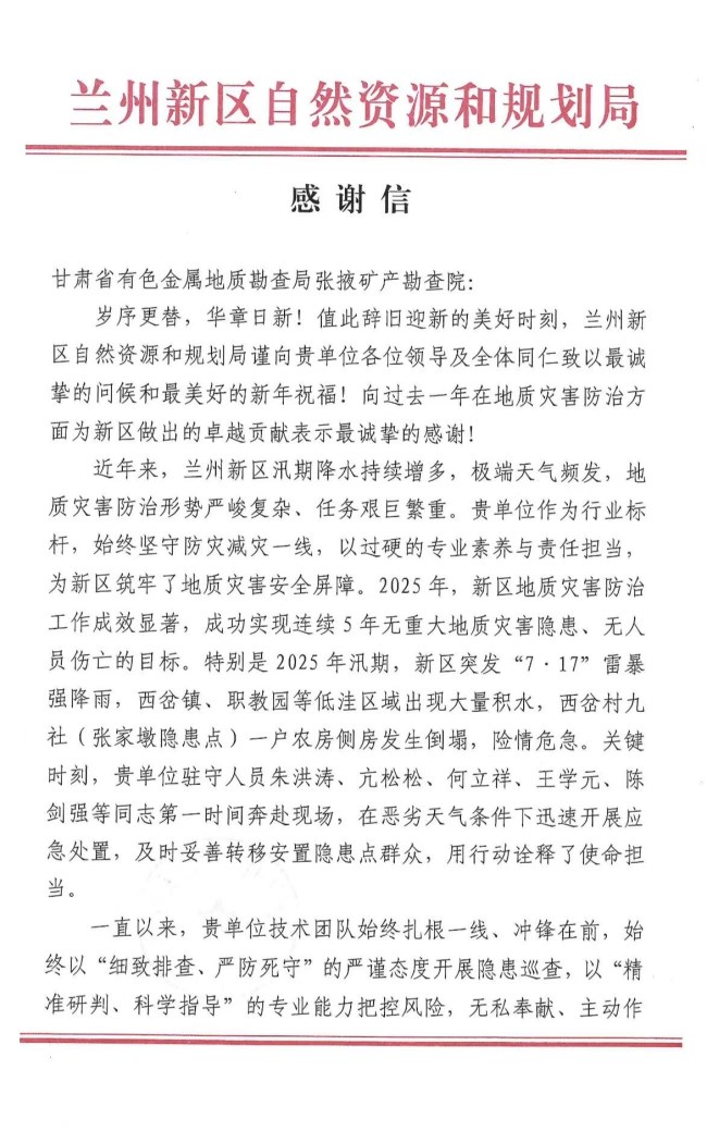 1月5日,张掖院收到来自兰州新区自然资源和规划局的一封情谊真挚、赞誉满满的感谢信。这不仅是2026年伊始我院收到的第一封正式感谢信,更是对我院在地质灾害防治领域专业能力与责任担当的充分肯定。 感谢信中,兰州新区自然资源和规划局对我院多年来,特别是过去一年为新区地质灾害防治工作做出的卓越贡献表示最诚挚的感谢。信中指出,近年来兰州新区地质灾害防治形势严峻复杂,我院作为行业标杆,始终坚守防灾减灾一线,以过硬的专业素养与高度的责任感,为新区筑牢了安全屏障,助力新区成功实现连续5年无重大地质灾害隐患、无人员伤亡的目标。 信中还特别提到,在2025年汛期应对“7.17”雷暴强降雨等突发险情时,我院驻守人员朱洪涛、亢松松、何立祥、王学元、陈剑强等同志,关键时刻冲锋在前,迅速开展应急处置,妥善转移安置群众,他们用果敢行动和过硬专业能力,在风雨中筑起了一道守护人民生命财产的安全屏障。 此外,兰州新区自然资源和规划局高度评价了我院技术团队一直以来扎根一线、细致排查、精准研判的工作作风,以及双方在科普宣传、专业培训、巡查监测、预警发布、应急保障等方面的深度协作。这些共同努力为新区科学防灾减灾、守护人民群众生命财产安全奠定了坚实基础。 这封感谢信,对我院而言既是珍贵的荣誉,更是前进的鞭策。它不仅承载着合作单位的深厚情谊与高度信任,也凝结着我院全体参与新区地质灾害防治工作职工的辛勤付出与执着坚守。下一步,我院将继续秉持精益求精的专业精神,持续深化与各方的协作,扎实做好各项技术支撑与服务,为省域内外地方经济安全稳定与高质量发展贡献更加坚实的张掖院力量。 以下为感谢信全文: