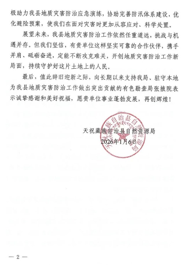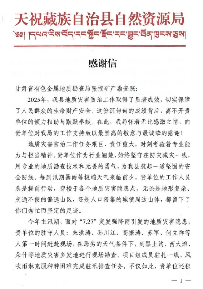 1月6日,我院收到天祝藏族自治县自然资源局发来的感谢信,对2025年度我院在该县地质灾害防治工作中提供的专业技术支持与一线辛勤付出表示高度肯定和衷心感谢。 信中指出,面对去年主汛期“7·27”突发强降雨险情,我院驻守技术人员朱洪涛、孙川江、高振涛、苏军、何立祥等人迅速响应、冲锋在前,第一时间赶赴黑土沟、西大滩、朵什等多处隐患点,在恶劣天气条件下开展应急勘查与隐患排查,为科学处置险情提供了及时可靠的技术支撑。此外,我院还协助该县开展地质灾害应急演练,参与优化防汛避险预案,切实提升了地方防灾减灾能力。 这是我院2026年收获的第二封地方政府感谢信。每一份认可,都承载着对我院专业能力和服务精神的高度肯定,也见证了双方在防灾减灾工作中协同共进的扎实成效。下一步,我院将继续发挥专业优势,主动加强与地方协作,全力做好防灾减灾和应急救援技术支撑,为保障人民群众生命财产安全持续贡献张掖院力量。 以下为感谢信全文: