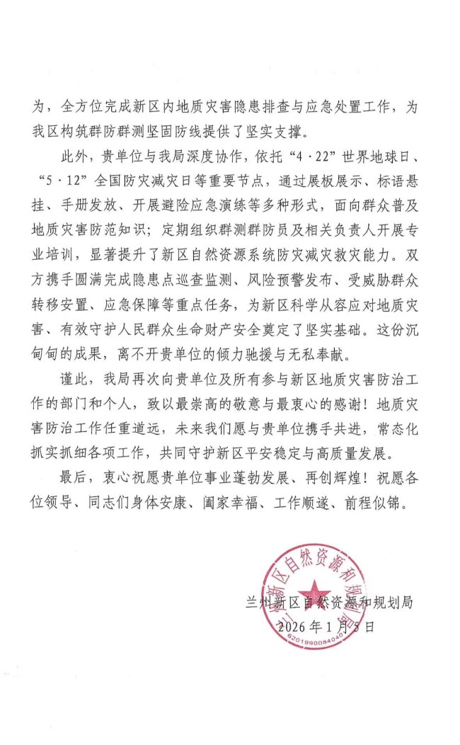 1月5日,张掖院收到来自兰州新区自然资源和规划局的一封情谊真挚、赞誉满满的感谢信。这不仅是2026年伊始我院收到的第一封正式感谢信,更是对我院在地质灾害防治领域专业能力与责任担当的充分肯定。 感谢信中,兰州新区自然资源和规划局对我院多年来,特别是过去一年为新区地质灾害防治工作做出的卓越贡献表示最诚挚的感谢。信中指出,近年来兰州新区地质灾害防治形势严峻复杂,我院作为行业标杆,始终坚守防灾减灾一线,以过硬的专业素养与高度的责任感,为新区筑牢了安全屏障,助力新区成功实现连续5年无重大地质灾害隐患、无人员伤亡的目标。 信中还特别提到,在2025年汛期应对“7.17”雷暴强降雨等突发险情时,我院驻守人员朱洪涛、亢松松、何立祥、王学元、陈剑强等同志,关键时刻冲锋在前,迅速开展应急处置,妥善转移安置群众,他们用果敢行动和过硬专业能力,在风雨中筑起了一道守护人民生命财产的安全屏障。 此外,兰州新区自然资源和规划局高度评价了我院技术团队一直以来扎根一线、细致排查、精准研判的工作作风,以及双方在科普宣传、专业培训、巡查监测、预警发布、应急保障等方面的深度协作。这些共同努力为新区科学防灾减灾、守护人民群众生命财产安全奠定了坚实基础。 这封感谢信,对我院而言既是珍贵的荣誉,更是前进的鞭策。它不仅承载着合作单位的深厚情谊与高度信任,也凝结着我院全体参与新区地质灾害防治工作职工的辛勤付出与执着坚守。下一步,我院将继续秉持精益求精的专业精神,持续深化与各方的协作,扎实做好各项技术支撑与服务,为省域内外地方经济安全稳定与高质量发展贡献更加坚实的张掖院力量。 以下为感谢信全文:
